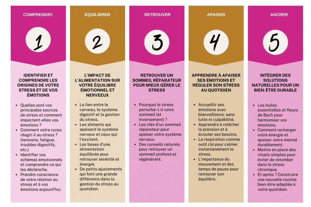 Le programme repose sur une approche globale combinant naturopathie, réflexologie, techniques de relaxation et gestion émotionnelle. Vous découvrirez des outils issus de la respiration, de la méditation, de réflexologie, de l’EFT (Emotional Freedom Technique) ainsi que des conseils en hygiène de vie et en équilibre alimentaire pour apaiser votre système nerveux. Tout est adapté à votre rythme et à vos besoins spécifiques.